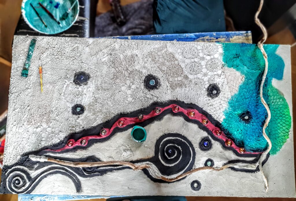 Aufhänger gesucht – Haptisches Wandgemälde Haptische Wandverzierungen – das hört sich erst einmal danach ein, als hätte die Wandkunst immer einen festen Platz. Dass das nicht so sein muss, zeigt mein haptisches Wandgemälde. Entstehungsprozess
